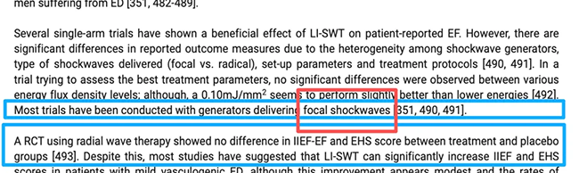 一些单臂试验显示,低强度冲击波治疗(LISWT)对患者自我报告的勃起功能(EF)具有有益作用。然而,由于冲击波发生器的异质性、所传递冲击波类型(聚焦型 vs. 发散型)、设备设置参数以及治疗方案不同,各研究所报告的结局指标存在显著差异。