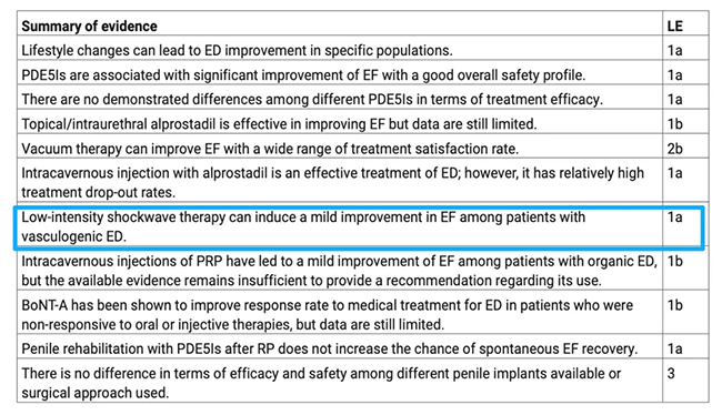 低强度冲击波治疗可使血管源性勃起功能障碍(ED)患者的勃起功能(EF)获得轻度改善证据等级为1a