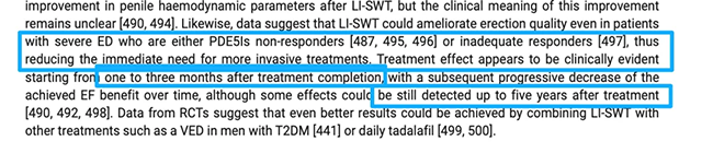 LISWT 也可能改善重度 ED 患者的勃起质量,包括对 PDE5 抑制剂(PDE5Is)无反应者或反应不足者,从而减少对更侵入性治疗的即时需求。治疗效果通常在疗程结束后 1–3 个月开始出现临床可见改善,随后已获得的勃起功能获益会随时间逐渐下降;不过,部分效果在治疗后最长可达 5 年仍可检测到。